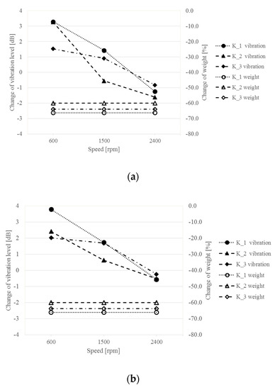 Quantitative comparisons of the change in vibroactivity of composite housings K_1–K_3 in relation to the Steel housing were also made by determining the change in vibration level at three different gearbox rotational speeds: 600, 1500 and 2400 rpm. Figure 10 shows the obtained results of vibration level change measurements and the differences in weight of the composite housings used (in relation to the Steel housing).