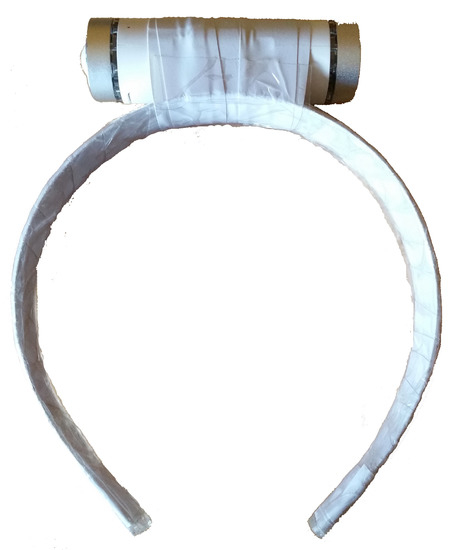 - Signal acquisition: In this study, we employed Node+ sensor platform to measure tremor signals [20]. Node+ consists of a Bluetooth enabled main board with 3 different sensors: accelerometer, gyroscope and magnetometer that are able to measure the corresponding physical phenomena in 3 dimensions. Node+ is capable of real-time streaming of measurements with sampling frequency up to 70 Hz. The accelerometer can measure up to ±2, 4, 8 and 16 g (with resolution 61 g, 122 g, 244 g, and 488 g) along all three axes, whereas the gyroscope has angular velocity range of up to ±250, 500, 1000 and 2000 degrees per second (with resolution 0.00763, 0.015, 0.03 and 0.06 degrees per second). Finally, magnetometer’s range is ±1200 T. For the purpose of measuring tremor in the patient’s head, Node+ is attached to the support as it has been shown in Figure 2.