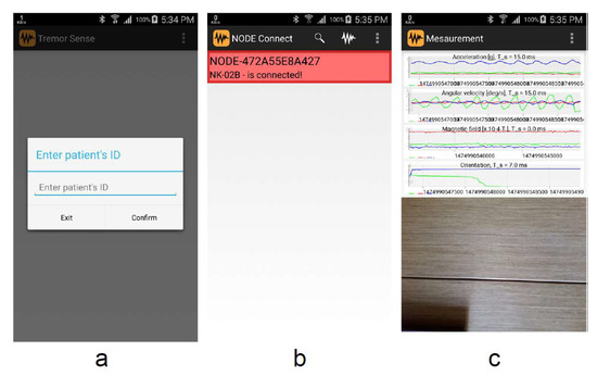 Figure 3. TremorSense Android mobile application. - Data storage and analysis block are implemented as a web application capable of storing uploaded measured data (in .csv format) in the local server file system, and allowing an authorized user to download them to its PC computer. Currently, the data analysis is performed by using Matlab software. The aim is to further improve the web application with analysis capabilities deployed on the server, once the optimal signal processing algorithms have been identified.