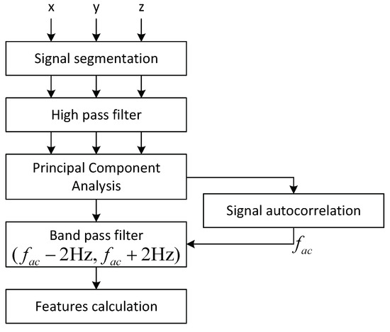 All the signals from the triaxial gyroscope are recorded with the sample period of 15 ms that corresponds to a 66.67 Hz sampling rate for a total duration of 10 s. The bandwidth of the gyroscope is 30 Hz, which covers the expected frequencies of the head tremor. Such recording duration was chosen in order not to make patients remain in uncomfortable positions for a long time. The tester is provided with the live measurement shown on the mobile application screen, so that she can track in real-time whether the measurements are correct, and no other type of motion, which could potentially ruin the measured signal, is accidentally made by the patient. The measurements are repeated until the recording of good quality is obtained. The signals are streamed via Bluetooth connection to a TremorSense Android application that is installed on a smart phone, where the data are stored in a .csv file with 4 columns (timestamp, x-axis, y-axis and z-axis measurement). Once the particular recording has been created, it is uploaded to the remote server, so that it can be downloaded for analysis by using Matlab software. As it can be seen in the signal processing chain, which is presented in Figure 4, firstly the signal is segmented by cutting the first and the last 10% of the overall duration in order to focus only on the stable part of the signal. Next, the signal is filtered by using a high-pass Butterworth IIR filter with zero phase and cutoff frequency of 0.2 Hz, in order to correct the trend that cannot be attributed to the tremor. Then, principal component analysis (PCA) is performed on the 3D signal obtained from the gyroscope (The reason why, in this work, we considered the gyroscope measurement is because the head tremor is rotational motion, which can be properly sensed by a gyroscope, free of gravitational effect (like in the case of accelerometer), as it is shown in [21].) sensor in order to isolate the dominant axis of the tremor, similarly to [18]. As it is shown in Figure 5, PCA can be seen as a physical rotation of the sensor, so that the greatest contribution to tremors can be attributed to the first principal component. In the sequel, we focus exclusively on a 1D signal which represents the first principal component. The next step includes the calculation of auto-correlation of the signal that is used in order to calculate the dominant frequency of the signal . Next, the signal is passed through a band-pass filter composed of separate low-pass and high-pass filter with cut-off frequency set to Hz and Hz, respectively. Finally, this signal is used as a basis for calculation of a number of features as follows: