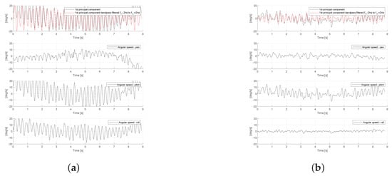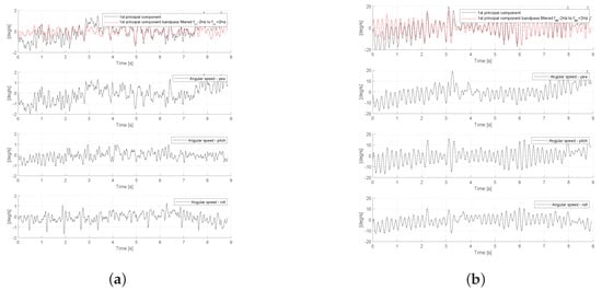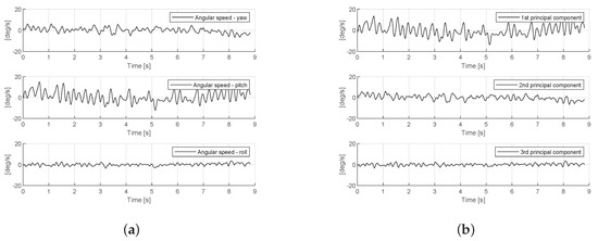 Gyroscope signal measured at the head of a patient with cervical dystonia (Patient-48). (a) measured signal from triaxial gyroscope; (b) principal components of the measured signal.