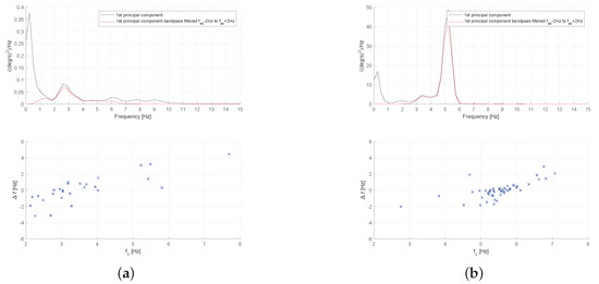 In Figure 9, we present the power spectral density (PSD) and inter cycle variation of signal frequency for two aforementioned patients (Patient-1 from A1 group and Patient-28 from B1 group). As we can see, the PSD of the gyroscope signal (actually the 1st principal component of the triaxial signals vector) shows a prominent peak at frequency 5.21 Hz, and, at the same time, its inter cycle variation of frequency is smaller as can be seen at the bottom Figure 9b, where we observe a higher concentration of points around the peak frequency. This behavior can be further confirmed by looking at the mean values of ICVF std and ICVF iqr values in Table 3, which are significantly higher for the group of patients without tremor that belong to group A1.