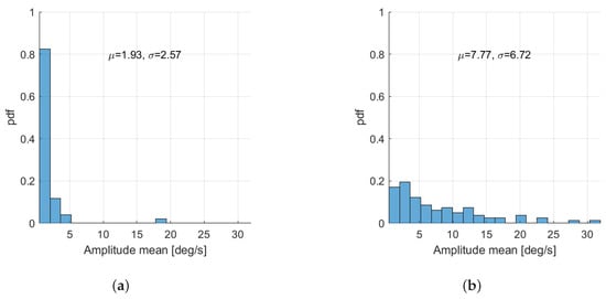 Next, in Figure 10, we present the distributions of the mean amplitude feature for A1 and B1 groups of patients, where the mean feature is calculated for each patient as the mean of amplitude defined in Equation (1). As we can see from Figure 10a,b, the mean of gyroscope signal amplitude for patients from the A1 group is significantly smaller than the mean amplitude for patients from the B1 group.