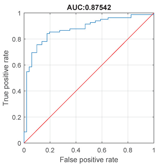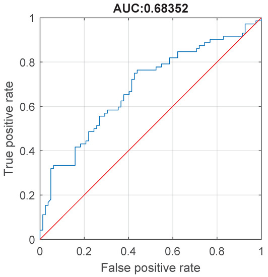 Again, we estimate the classification accuracy of SPCR feature in the differential diagnosis of patients with essential tremor and cervical dystonia with head tremor. It is assessed by means of receiver operating characteristics analysis, which is presented in Figure 15. In this test, we consider as positive class A2, and the negative class B2. Again, the threshold for differentiation of essential tremor from cervical dystonia is identified by selecting the cutoff value which maximizes the distance between sensitivity and 1-specificity. In particular, the optimal point is the one where the sensitivity = 0.75 while specificity = 0.5732, which corresponds to threshold 0.5202.