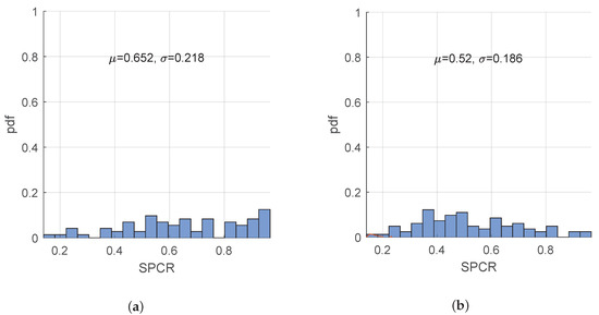 Next, we consider SPCR as a potential measure to differentiate between groups A2 and B2, as it is shown in Figure 14. As expected, SPCR is distributed more towards 1 (), for patients in group A2 (essential tremor), which are more regular and tend to have most of their power distributed around the peak frequency. As for head tremor associated with cervical dystonia, we see that SPCR is distributed more towards lower values (), suggesting less concentrated power around the tremor peak frequency.