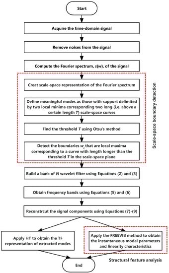 Spectra instead of the Fourier one, such as the standardized autoregression power spectrum [29] and the pseudo-spectrum obtained by the multiple signal classification approach [30,31], have been used in some studies to reduce the disturbance of noises on the boundary detection in EWT. Nevertheless, it may not be so convinced that no useful structural information is overlooked. This study still uses the Fourier spectrum to build the wavelet filter bank, though it is susceptible to noises. For this study, the improvement of EWT lies in the boundary detection method, or the definition of boundaries. The Fourier spectrum is transformed to the scale-space, and the boundaries are those corresponding to scale-space curves above a certain length.