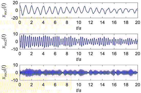 The 20-s simulated signal with an SNR of −2 dB is shown in Figure 2a. The sampling frequency is 50 Hz. The boundaries for the spectrum segmentation are detected using the scale-space method stated in Section 3.1.1, and the result is shown in Figure 2b. The threshold for the boundary detection is calculated to be 14 by the Otsu’s method. Thus, minima scale-space curves with length longer than 14 are the boundaries. The empirical wavelets are defined according to Equations (2) and (3) based on these boundaries. Using these basis functions, WT is applied to decompose the signal. The extracted signal components, xrec1(t) to xrec3(t) are displayed in Figure 3. All the three components are extracted without redundant modes.