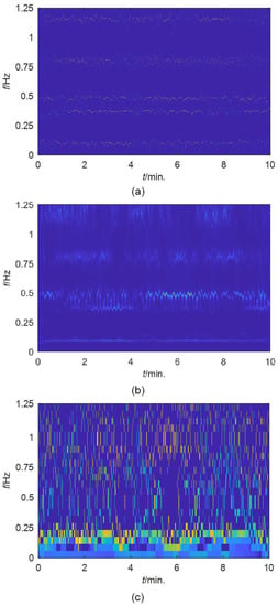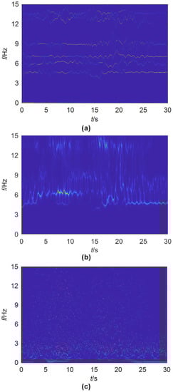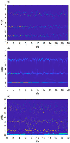 under the assumption that Sj(t) and φ′(t) vary much slower than φ(t). TF planes obtained by these two methods are shown in Figure 4b,c. The three signal components are separated by SWT with satisfactory frequency resolution. However, in the EMD results the instantaneous frequencies of the second and third components are not so legible. Redundant modes below 1 Hz are produced.