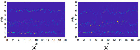 TF planes of mono-components extracted from the simulated signals with an SNR of: (a) −6 dB; (b) −10 dB.