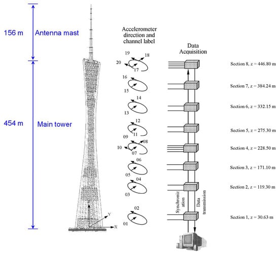 A long-term SHM system was deployed on the tower for real-time monitoring of the structure [37]. As part of this system, 20 uniaxial accelerometers (Tokyo Sokushin AS-2000C) are installed on eight different cross-sections of the main tower (Figure 7) to measure the structural dynamic responses. Accelerometers 01, 03, 05, 07, 08, 11, 13, 15, 17, and 18, are used to collect the response in the short-axis direction, while others measure in the long-axis direction. The sampling frequency for the acceleration data is 50 Hz 24-h (18:00 p.m. 19 January 2010 to 18:00 p.m. 20 January 2010) data recorded during one construction stage are provided for a benchmark study [38].