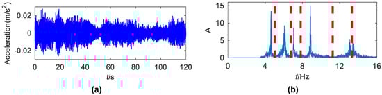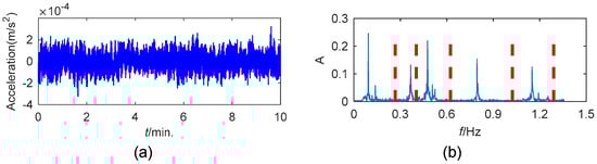 (a) The time history of the analyzed acceleration from DHF; (b) the detected boundaries in the Fourier spectrum.