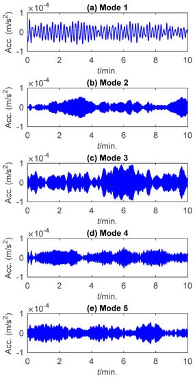This study used the data collected by the accelerometer 11 from 05:00 a.m. to 05:10 a.m. on 20 January 2010. The time history of the data and the corresponding frequency boundaries detected by the scale-space approach are shown in Figure 8. The first five components extracted by EWT are displayed in Figure 9.