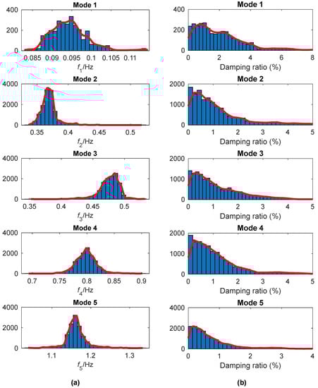 The histograms for the instantaneous frequencies and damping ratios of the extracted modes are shown in Figure 11a,b, respectively. The most probable value for each mode is considered as the modal parameter of the tower. They are listed in Table 1 with the corresponding CVs. In [39], the CVs for the modal frequencies are less than 0.005, and those for the damping ratios are less than 0.90. The CVs in Table 2 are much larger. The main reason is that in this study they are derived directly from a randomly selected signal with a duration of only 10 min, where there may be disturbances from environment, loads and so on. In contrast, the previous study uses data segment length long enough (one-hour) to reduce the noise effects. Moreover, in this study the 24 measurements of one-hour duration were not used directly but first decomposed into 70 overlapping data sets of one-hour duration with a 20-min shift. In Table 1, another observation is that the CVs of the damping ratio are much larger than those of the modal frequency. It is mainly because that the identified damping ratio of a structure is usually not as stable as the natural frequency.