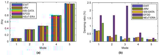 As verification, the identified modal frequencies and damping ratios are compared with those obtained by the vector autoregressive (ARV) technique [40], the data-driven stochastic identification (SSI-DATA) method [40], the enhanced frequency domain decomposition (EFDD) algorithm [41], and an improved automatic modal identification method based on NExT-ERA [41], respectively. This comparison is shown in Figure 12 using bar plots. The modal frequencies identified by EWT agree quite well with those obtained by the other four methods. Though relatively big differences exist in the damping ratios identified by distinct methods, the values obtained from EWT have a satisfactory accordance with those determined from ARV and SSI-DATA.