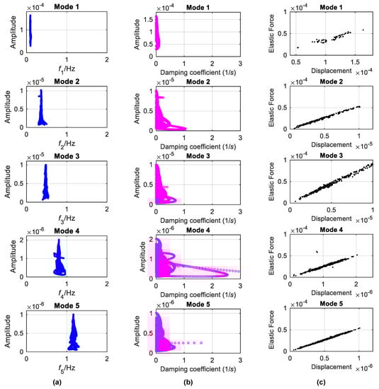Using the extracted mono-components, the backbones, damping curves and elastic forces corresponding to each mode of the bridge are also analyzed by the FREEVIB method (Figure 20). The backbones can be considered as vertical lines, implying that the identified instantaneous frequencies do not vary with the vibration amplitude. Though the damping coefficients are quite decentralized, they also do not change evidently with the amplitude. It is deduced that the DHF can be considered as a linear system in the analyzed condition, which is further validated by the identified elastic-force characteristics shown in Figure 20c.