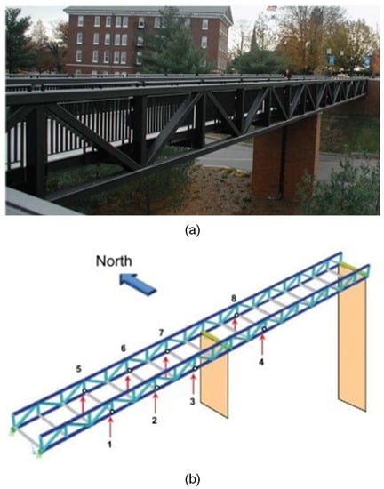 A vibration-based continuous SHM system with 8 accelerometers and 10 thermocouples has been deployed on the Dowling Hall Footbridge (DHF) at Tufts University in Medford. This footbridge is 44 m long and 3.7 m wide. As shown in Figure 14a, it is a two-span continuous steel frame bridge. The eight uniaxial accelerometers were permanently installed on the underside of the bridge [42] to measure the structural vibration under ambient stimulations, as displayed in Figure 14b. More details about this bridge and its monitoring system can be found in [42,43].