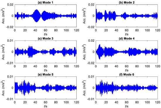 Data of seventeen weeks have been released to the public. A set of 300-s data was recorded once an hour with a sampling frequency of 2048 Hz. This study analyzes acceleration data collected by accelerometer number 1 (Figure 11b) from 11:30 a.m. to 12:00 a.m. on 30 March 2010. Its time history and detected frequency boundaries are shown in Figure 15. Figure 16 displays the first six components extracted by EWT.