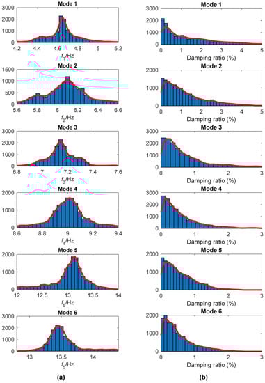 Figure 18 shows histograms of the instantaneous frequencies and damping ratios for the extracted modes obtained by the FREEVIB method. As in the Canton tower case study, the most probable values corresponding to each mode is adopted as the modal parameter of the structure. The modal parameters derived in this way are listed in Table 3 as well as the corresponding CVs. The CVs for the fifth and sixth modal frequencies are much larger than those for others. The reason is that these two modes are more sensitive to disturbances, and the corresponding instantaneous frequencies fluctuate relatively greatly with time, as shown in Figure 14a. Similar to the CVs of the damping ratio for Canton Tower, those of DHF are also very large because of the inherent instability.