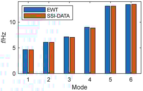 To verify the modal frequencies identified by the proposed methodology, they are compared with those from a preliminary dynamic test on 4 April 2009 [44], for which the modal parameters were identified by the SSI-DATA method. The comparison bars are shown in Figure 19. The EWT results are extremely close to those determined from the modal test. The closely spaced modes, i.e., the fifth and the sixth ones, are well identified by EWT. In contrast, the SSI-DATA method requires selecting the order carefully.