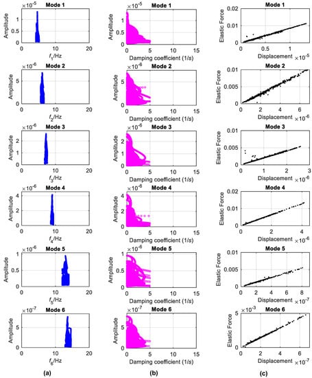 The backbones estimated by the FREEVIB method for each mode and the corresponding damping curves are displayed in Figure 13a,b, respectively. The identified instantaneous frequencies almost do not vary with the vibration amplitude. On the other hand, for the damping coefficients no obvious varying trends exist with the amplitude, though they are more scattered than the instantaneous frequencies. This implies that under the analyzed condition the Canton tower can be considered as a linear system. This is affirmed by the identified elastic-force characteristics illustrated in Figure 13c.
