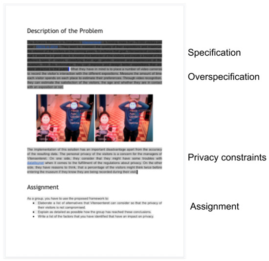 The second paragraph introduced the requirement of taking into consideration the users’ privacy. This requirement was presented from two different perspectives: first, the regulatory perspective of privacy (by stating that the organizers needed to comply with the applicable privacy related regulations) and, second, the aspect of privacy as a concern of the users that could feel bothered by being recorded. The assignment for the students was to use one of the frameworks mentioned in Section 3.2, to analyze the scenario and elaborate a list of alternatives for the Science Museum to consider in their final design. The problem description document had 301 words in total, distributed over the four sections: specification (95 words), overspecification (61 words), privacy constrain (87 words), and assignment (58 words).