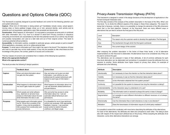 - Iachello, G.; Abowd, G.D. From privacy methods to a privacy toolbox: Evaluation shows that heuristics are complementary. ACM Trans. Comput.-Hum. Interact. (TOCHI) 2008, 15, 8. [Google Scholar] [CrossRef]