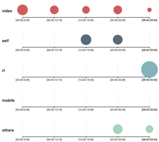At minute 15:45, the QOC-FC groups were asked if they had considered any alternative that did not involve video recording, even if that required to reduce the amount of information that could be captured. To this question, Group A answered that they did not really consider any other alternative to video recording, and Group B answered that they had considered only the feedback terminal (from the category of self reported interaction mechanisms). After that intervention from group B, the other interventions from the rest of the members started incorporating other types of interaction mechanism to the discussion, for example, the usage of the same entrance ticket to be scanned when using each exhibition. Asking the groups that used PATH if they had considered any interaction mechanism other than video recording was not applicable, as they already started discussing other interaction mechanisms from their first intervention. In the last part of the interview (Minute 25’26 for the QOC-FC interview and minute 22’36 of the PATH interview), the students are requested to be more open-minded and propose alternatives without considering any technical limitations. Both, QOC-FC and PATH groups propose an ideal technology capable of reading the mind [52] of the visitors. As there was not previous mention to any RF based interaction mechanism in the QOC-FC interview, groups A and B were explicitly asked by the interviewer if they were familiar with that technology. This question triggered a brainstorming session (Figure 3, minutes 26’40–33’43) where the students argued about the benefits and limitations of using Wifi or Bluetooth signals of the phone or a museum guide’s device to triangulate their position. The students then concluded that this might have been a good idea.