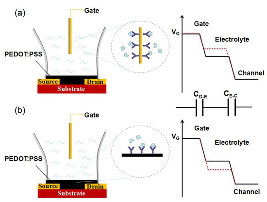 Schematic diagram of an OECT: (a) gate surface as the sensing interface, the potential distribution between gate and channel is changed by the reaction on the gate; (b) channel surface as the sensing interface, the potential distribution between the gate and channel is changed by the reaction on the channel.