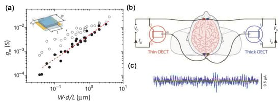 As shown in Figure 3a, Rivnay et al. [30] systematically studied the geometry-performance relationship of OECTs and found that the transconductance was proportional to the channel volume W·d/L. In order to demonstrate the conclusion, they measured electroencephalography on a human volunteer using two different geometrical OECTs. As shown in Figure 3b, two OECT devices with the same channel dimensions (W = 50 mm, L = 50 mm) but the different thickness (d = 230 nm, d = 870 nm) were attached on the body of volunteer. The experimental results indicated the thick OECT provided better ability in electroencephalography recording (Figure 3c). However, since the electrochemical switching process of OECTs is complicated [31,32], the related fundamental mechanism behind their operation remains largely unexplored, and still more detailed work is needed to clarify the influence of geometry on device performance.