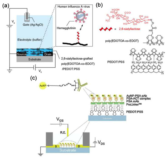 Schematic illustration of functionalization of PEDOT:PSS channel for the detection of (a,b) human influenza A virus and (c) prostate specific antigen. Figure reproduced with permission from references [39,40].