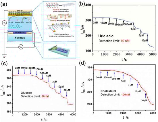 (a) Schematic diagram and (b) Current responses of a uric acid-sensitive OECT with a UOx-GO/PANI/Nafion-graphene/Pt gate. (c) Current responses of an OECT with GOx-GO/PANI/Nafion-graphene/Pt gate electrodes to additions of glucose. (d) Current responses of an OECT with ChOx-GO/PANI/Nafion-graphene/Pt gate electrodes to additions of cholesterol. Figure reproduced with permission from reference [57].
