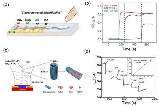 (a) Schematic diagram of a finger-powered PDMS microfluidic OECT platform and (b) the current responses to the successive additions of the three analytes. Figure reproduced with permission from reference [62]. (c) Schematic diagram of an OECT glucose sensor using Nafion/GOx/Pt-NPs/TNTAs as a gate electrode and (d) the current responses to the successive additions of glucose. Figure reproduced with permission from reference [5].