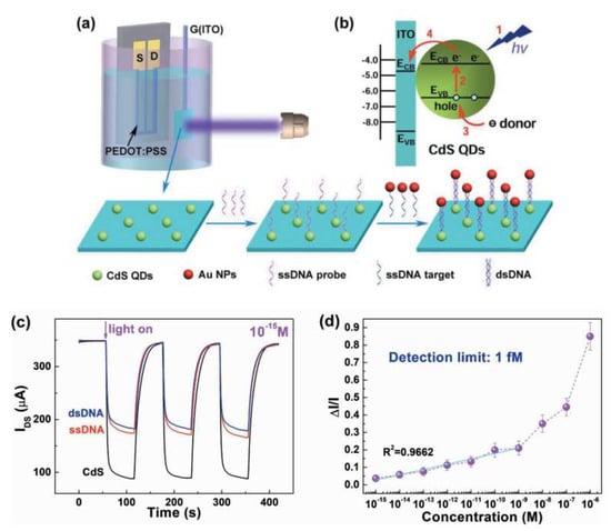 (a) Schematic diagram of an organic photoelectrochemical transistor (OPECT)-based biosensor for the DNA detection, and (b) the charge transfer between CdS quantum dots (QDs) and indium tin oxide (ITO) gate electrode under light illumination. (c) Channel current (Ids) versus time at several repeated light on/off cycles with the immobilization of DNA. The concentration of the ssDNA probes is 1 × 10−15 M. (d) Dependence of ΔI/I on the concentration of ssDNA targets. Figure reproduced with permission from reference [51].