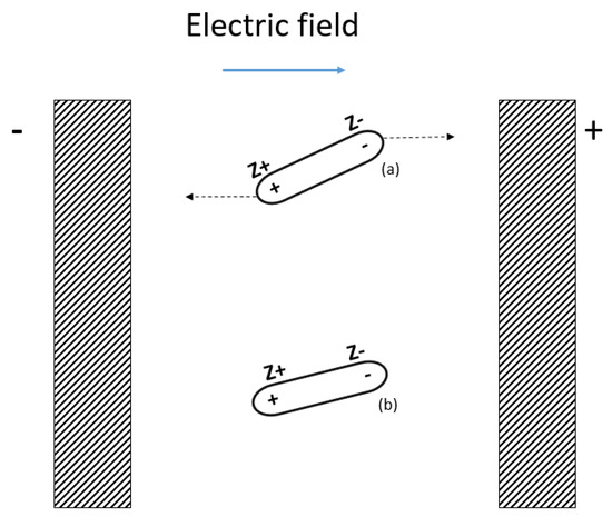 Molecule polarization under the electric field influence (a) original state, (b) polarized.