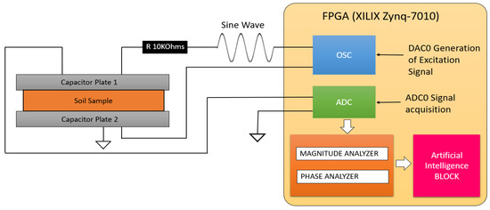 The module of the data signal processing spectroscopy module was developed to obtain the frequency response in terms of the magnitude and phase of a soil sample. Figure 2 shows the configuration of the electric circuit. The sensor is part of a voltage divisor and acts as an resistor-capacitance (RC) filter, which is required to know the frequency response of the sensor. The excitation signal is generated by the control module. This control module is formed by an MyRIO platform (National Instruments, Austin, TX, USA) from National Instruments that contains an FPGA XILIX Zynq-7010 and a 667 MHz dual-cortex ARM Cortex-A9 processor, which was programmed to generate the excitation signal and at the same time acquire the frequency response in magnitude and phase from the sensor. At the end of the study, it is possible to obtain the behavior of the sensor in magnitude and phase throughout the band of frequencies. The following diagram represents a distinctive pattern which allows the algorithms of artificial intelligence to estimate and quantify the content of the physicochemical variables.