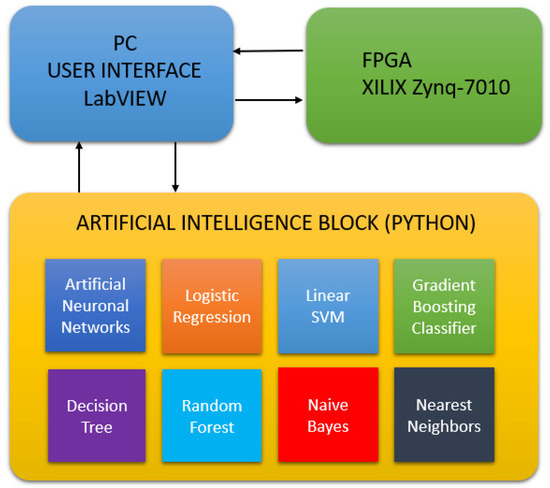 Integration of the personal computer (PC) graphical user interface (GUI) with the FPGA and the artificial intelligence block.