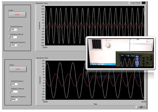Figure 4 shows the user interface functioning. The excitation signal can be observed in white, and the response signal can be observed in red. The changes in the magnitude and phase of the signal can be appreciated when the frequency changes.
