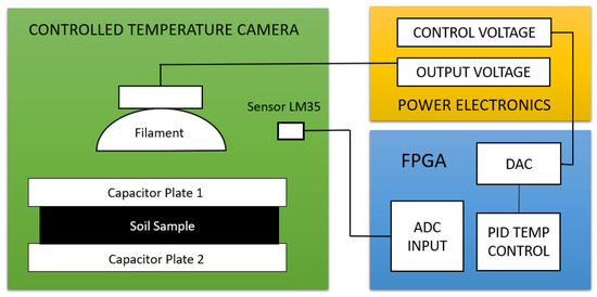 In the derived equation, a constant temperature is assumed, but physicochemical properties can be affected by the temperature. Therefore, a chamber of controlled temperature was necessary, due to the temperature generating deviations in the magnitude and phase graphics of the signal. To achieve the above, a temperature sensor (LM35) was used to monitor and control the temperature in the measuring chamber; this sensor with an incandescent filament generates thermic radiation inside the camera. The voltage supplied to the filament was generated by an electronic dimmer. This dimmer requires a control voltage, which is supplied by the FPGA. The programmed Proportional Integrative Derivative (PID) temperature control, inside the FPGA, has an established set point at 30 °C as the reference point of the controller. The temperature was chosen because this is the average temperature at the locations with sugar cane crops. Figure 5 schematically shows the integration of the FPGA, the power electronics, and the controlled temperature chamber.