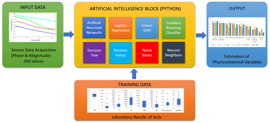 A subset of the samples was used for training the algorithms and the rest of the sub-samples for validation. For comparison purposes, the data of the training results, the results with the test data, and the time of training were obtained for each of the algorithms. A ratio of 70/30 is usually implemented to divide the training and validating data; this ratio is chosen due to it containing enough data to accomplish the analysis. Figure 7 indicates the procedure to determine the psychochemical properties of soil using artificial intelligence algorithms. The input data acquired by the sensor is sent via transfer control protocol/internet protocol (TCP/IP) to Python, in which the artificial intelligence block is programmed.