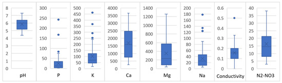 Variables statistics of the 100 soil samples (pH, P, K, Ca, Mg, Na, conductivity, and N2-NO3).
