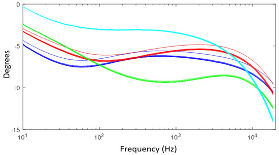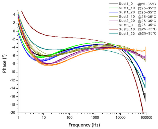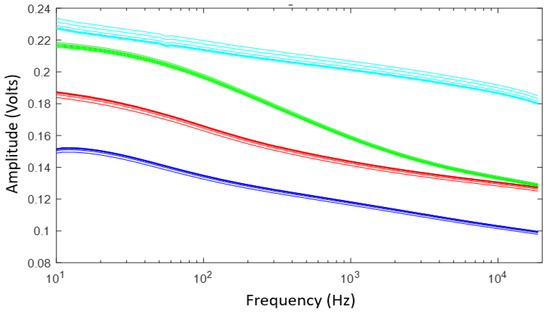The frequency response of four samples in amplitude (Figure 9) and phase (Figure 10) for the most different samples, according to the laboratory measurements, was obtained. Each sample was subdivided into eight sub-samples; the sub-samples are plotted using the same color as their corresponding soil sample. As can be seen from Figure 9 and Figure 10, the frequency response behaves similarly with soils that have the same physicochemical conditions.