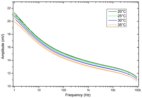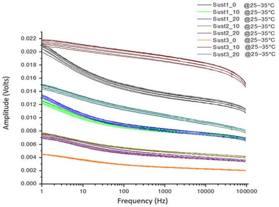 A group of eight soil samples was used to validate the frequency response of the sensor when there is a variation in temperature. For each soil sample, the temperature was set in the range from 25 °C to 35 °C in steps of 2.5 °C. As Figure 13 and Figure 14 show, the amplitude is reduced proportionally to the increment of temperature. The eight soil samples were clustered by a specific color, and each cluster contained the information of the frequency response in different temperatures. In all of the cases, the maximum amplitude of the frequency response of the sensor corresponded to the minimum temperature.