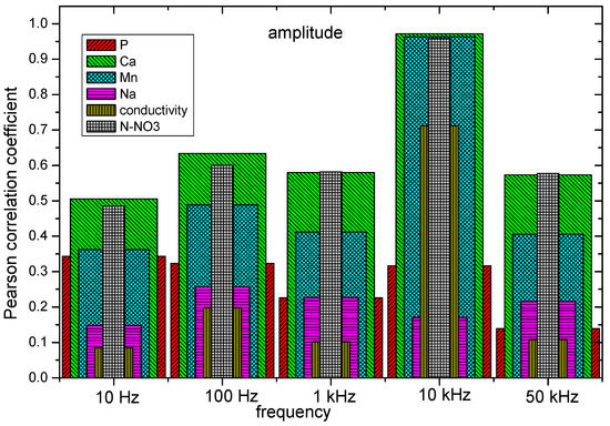 Pearson correlation coefficient of P, Ca, Mn, Na, conductivity, and N2-NO3 with respect to the amplitude in the range of frequencies of 10 Hz, 100 Hz, 1 KHz, 10 KHz, and 50 KHz.
