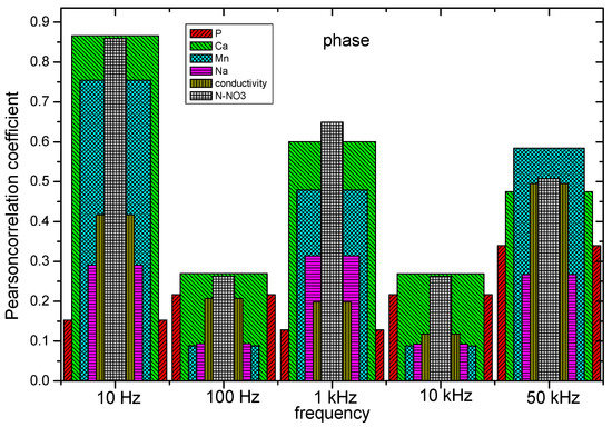 Pearson correlation coefficient of P, Ca, Mn, Na, conductivity, and N2-NO3 with respect to the phase in the range of frequencies of 10 Hz, 100 Hz, 1 KHz, 10 KHz, and 50 KHz.