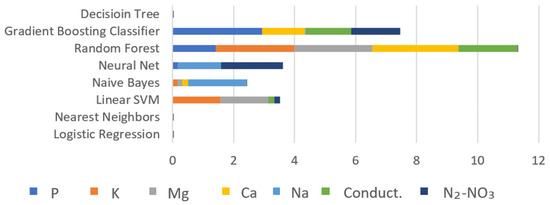By using the frequency response of the soil, a complex set of information is generated. Despite there being differences in the amplitude or phase spectra when the temperature, moisture, or chemical content varies, the differences cannot give useful information regarding the soil state. Amplitude and phase spectra were subject to different AI algorithms, which were written to predict the chemical composition of the soil. The implementation of the AI algorithms was carried out to obtain the estimation of the psychochemical variables of sugar cane soil. Figure 17 shows a graphic with the training times of classification of the P, K, Mg, Ca, Na, conductivity, and N2-NO3 using the AI algorithms of Decision Tree, Gradient Boosting Classifier, Random Forest, Neuronal Networks, Naive Bayes, Linear SVM, Nearest Neighbors, and Logistic Regression. The results indicate that Logistic Regression and Nearest Neighbors were trained faster than the rest of the algorithms.