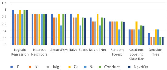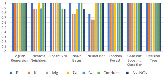 The 70% of the data were used to train the AI algorithms. Figure 18 shows the punctuation of the training process using pH, P, K, Ca, Mg, Na, conductivity, and N2-NO3 values for all of the AI algorithms that were implemented. It should be noted that the correlation coefficient of one was reached with the Logistic Regression, Random Forest, Gradient Boosting Classifier, and Decision Tree algorithms.
