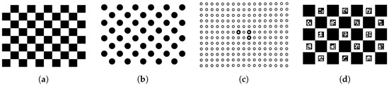 Currently, and for camera calibration are commonly obtained using planar checkerboards [11,16,17]. From the images of these boards, the checker corners are calculated and located. This location is used to estimate camera parameters, where the camera parameters contain the intrinsic matrix and distortion parameters. There are various kinds of checkerboards. The most common is a board used in OpenCV tutorials (see Figure 1a). Other types of boards exist (Figure 1b–d) using circles instead of corners. Boards with additional markers to detect partially occluded checkerboards also exist (Figure 1c,d). These types of calibration boards all have a limited number of detectable points per image, e.g., the 9 × 6 OpenCV checkerboard has 54 detectable points [11], where even a low-resolution camera has 76,800 pixels (320 × 240 pixels). Using a limited set of points can cause inaccurate calibrations with a large uncertainty (see Section 2).