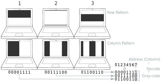 Gray-code pattern (first 3) Top: Pattern for row correspondences (top), column for row correspondences. An example of decodation of the column pattern is given. The example assumes only three patterns are given (eight columns). Figure based on Reference [6].