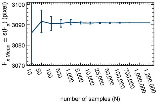In a first experiment, the effect of a higher number of calibration points was analysed. From a dataset of 15 camera positions, N random number of samples per camera position are taken, and the calibration is executed. In Figure 4 different calibration results (focal length) with a different number of samples are listed. For each sample size, the calibration is repeated 50 times. The samples are randomly selected from a complete dataset containing all samples from 15 different positions of the camera. The experiment shows that, when using more than 100,000 points, standard deviation goes below 0.14 pixels, and the mean focal length does not change. When using 700,000 points or more, standard deviation stays below 0.02 pixels. Therefore, in the following experiments, 700,000 points are used as input sample size. Calculating the calibration with 700,000 points takes approximately two minutes (computation done on 1 core @ 4 GHz). In comparison, a calibration using 54 points per view (checkerboard) takes less than one second.