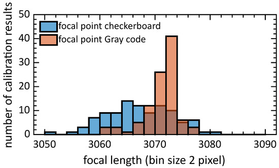 In this analysis (see Figure 5), the standard deviation of the focal length using Gray code was 3.30 pixels, which is lower than the focal length calculated with checkerboard corners (5.87 pixels). Note that in this experiment samples are taken randomly. Consequently, it is possible to build a bad dataset with only low-angled calibration patterns. For that reason, this experiment would most probably give higher deviations than real experiments done by an experienced user. However, since the same sampling is used for both techniques, the experiment can be used as a comparison. Note that in this dataset the lens of the camera was refocused and consequently the lens would have a slightly different focal distance compared to previous experiments.